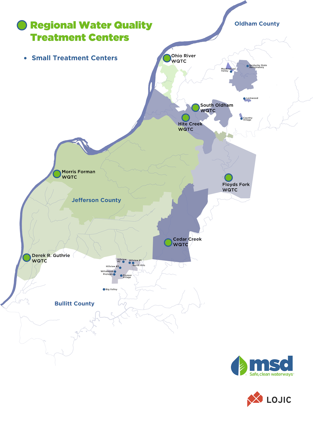 MSD operates and maintains Bullitt County’s smaller treatment plants for full compliance with all regulatory agencies. Planning is underway to decommission some smaller treatment plants that have passed their useful life and manage that service through the Derek R. Guthrie Water Quality Treatment Center in Jefferson County.